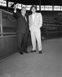 Cat President Spencer Harris, left, and Dodger Vice President E. J. "Buzzy" Bavasi look over Fort Worth ball park (LaGrave field) Monday afternoon.