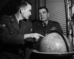 Colonel George T. Chadwell, right, one of the 15 survivors of Thursday night's B-36 crash near Goose Bay, Labrador, in which two crew members died, tells his story of the disaster at Carswell Air Force Base. With him is A/1C Audie G. McDowell, medical corpsman, who participated Saturday in the rescue of Master Sergeant Carroll W. Butin.