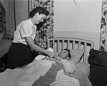 Master Sergeant Carroll W. Butin, first reported killed in a B-36 crash near Goose Bay, Labrador, takes a sip of water with the help of Mrs. Butin at the Carswell AFB Hospital while retelling the story of his 36-hour ordeal under nearly five feet of snow.