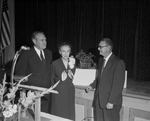 Bishop William C. Martin of Dallas, left, with his wife, accepts a television snack table and television light from Dr. A. Ward Hicks, right, president of the Methodist Men's Club of Central Methodist Church.