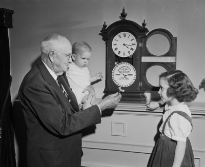 J.A. Feagin shows his great-grandson, Forrest B. Adams Jr., the key to the clock which has been in their family since 1878. The baby is the son of Mr. and Mrs. Forrest B. Adams, and the grandson of Mr. and Mrs. F. M. Adams.