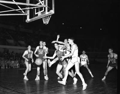 Southern Methodist University's Davis (32) and Art Flinder (45) and Texas Christian Univesity's Johnny Swaim (right) are held in apparent hypnotic spell by loose basket ball, while Frogs' Henry Ohlen (28) tries to break it up Tuesday.