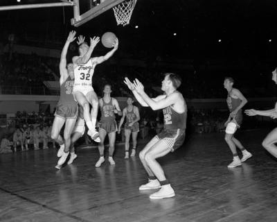 Texas Christian Univesity's Johnny Swaim leaps high for layup effort as Southern Methodist University's Jack Kastman (31) and Bob Clayton (24) come up too late to block attempt. Frogs won Southwest Conference game .