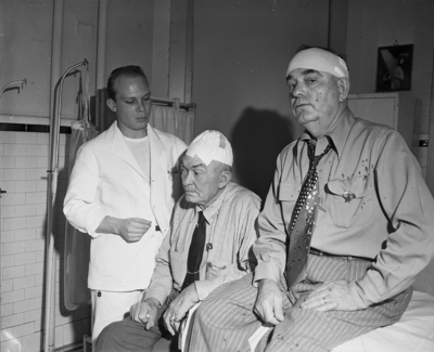Deputies Slugged - Jim Smith, center, night deputy, and Jason Young, desk sergeant, were struck from behind by the prisoners who overwhelmed them in the ground floor office of county jail. Here, Dr. W. L . Bass, intern at St. Joseph's Hospital, puts the finishing touch to the bandages. The men suffered deep scalp lacerations, were treated and released.