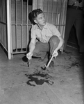Jailbreak Weapon - Trusty Owen Ainsworth, a witness to the break, holds the shower head used to slug three jail guards as prisoners escaped Wednesday night from the jail. The bloody glasses belong to Jason Young, desk sergeant, who was one of the injured. Ainsworth is standing by a pool of blood from Young's injury.