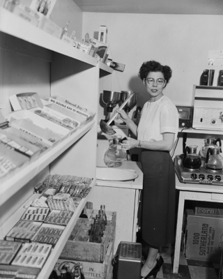 Mrs. Martha Ramey, a widow, with failing eyesight who needed to work but had to be placed in an occupation where sight is not essential. She takes up one of several vending stands stocked in Fort Worth by the State Commission for the Blind.
