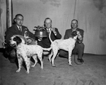 Joe's Wahoo Pal, right, best pointer and best dog in show, at Fort Worth Pointer and Setter Club's annual bird dog bench show, with owner, Joe Wilson of Itasca, right, and C. A. Corbett, center, club president, holding the best dog in show trophy, which he presented to Wilson. At left, A. P. Owens, 3633 Hampshire, with Lady Hampshire, best setter in show. Corbett presented the trophies on the stage of the Texas Sports and Outdoor Show at its closing performance in Will Rogers Memorial Coliseum. Published in the Fort Worth Star-Telegram morning edition, April 17, 1950.