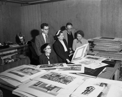 This jury had the tremendous task of selecting winners from a record 2,796 entries in the 26th annual Scholastic Art Awards regional competition. Their selections were being hanged at Stripling's where they could be seen by the public. The judges are, front row, Miss Merle Fincher, Dallas art teacher; Mrs. Ann Ebel, Oklahoma City art teacher; Mrs. Kathleen Lawrence, Fort Worth painter. Back row, Bror Utter, Fort Worth artist, and Dr. Kenneth B. Loomis, head of TSCW's art department at Denton.