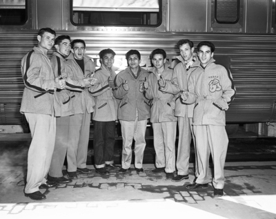 Texas' Golden Gloves team gives the 'thumbs up' sign before leaving for Chicago's Tournament of Champions. From left to right are Heavyweight Donnie Fleeman, Light-heavy Roy Harris, Middleweight John White, Welter Pete Perez, Lightweight Johnny Hernandez, Featherweight Raymond Garcia, Bantam Woody Keller and Flyweight Pete Melendez. White went as alternate for Eugene Cooper.