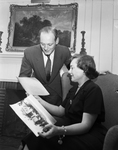 Lord Montagu of Beaulieu, who spoke Monday night to the English-Speaking Union, shows photographs of his 67-room ancestral home near Southampton, England, to Mrs. William Slay Jr. at the Slay home.