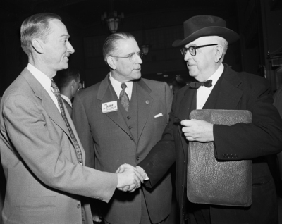 Joe A. Clarke, right, vice president of the Fort Worth National Bank, introduces Charles E. Haedgen Jr., president of the Lubbock National Bank, to Joe G. Montague, Counsel for the Texas and Southwestern Cattle Raisers Association, at the bankers meeting.
