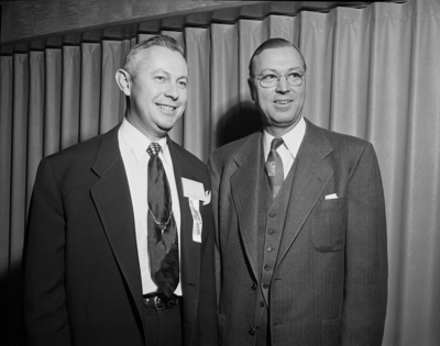 John F. Geis, assistant vise president of the First National Bank of Fort Worth, welcomes W. Guy Draper, president of the First National Bank of Temple and president of the Texas Bankers Association, as delegates gathered for the Seventh District meeting of the association at Hotel Texas.