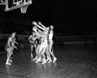 No casualties resulted from this teepee formation in Texas Christian Univesity triumph over Arkansas . Frogs' Richard Allen (29) and Ray Warren, right, duel Hogs' Gene Lambert and others for loose ball.