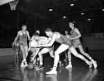 Poly's Dick O'Neal in foreground lunges with Sunset's Tom Kelley after the ball as the Parrots' Johnny Betts (15) and the Bisons' Alton Oliver close in. Poly won a state tournament berth by winning 51-47, in Dallas.