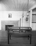 Interior of the blacksmith shop, with picture of Sam Houston above the mantle and the small glass case housing Texas mementoes.