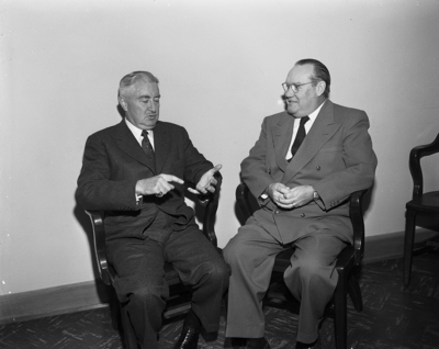 C. E. Hooper, left, talks shop with George Cranston, manager of WBAP and WBAP-TV. Hooper is the father of Cooperating's.
