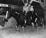 Three little Barbers, left to right, Raymond, Beverly, and Galen, do a triple-take on Queenie, as they look back at her colt. The children's parents are Mr. and Mrs. Earl Barber, 2429 Wabash. Published in the Fort Worth Star-Telegram morning edition, May 7, 1950.