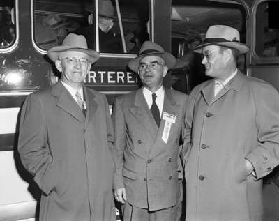 J. A. Elliott, left, division engineer of the public Roads Administration in Fort Worth, helped usher Oklahoma City visitors aboard a bus. In the center is Ross Taylor, city manager of Oklahoma City, and at the right is C. G. Baker, manager of the Oklahoma State Fair & Exposition.