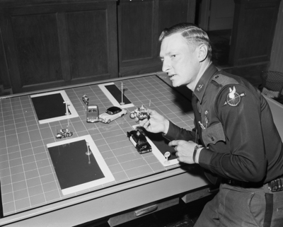 Motorcycle Officer Jimmy Stout holds a toy motorcycle which he touched up with more realistic details. The mock accident scene on table in background is composed of toy cars Stout donated to Corporation Court.