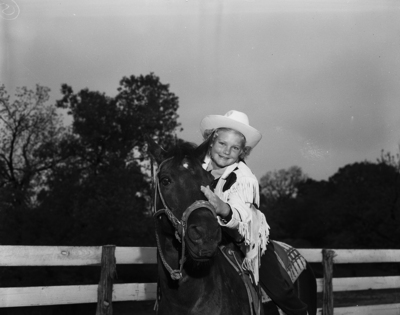Monna Wier, daughter of Dr. and Mrs. E. M. Wier, 1208 Mistletoe Dr. wearing western style clothes, pats her pony, "Blackie," after a ride in the park. Published in the Fort Worth Star-Telegram morning edition, May 7, 1950.