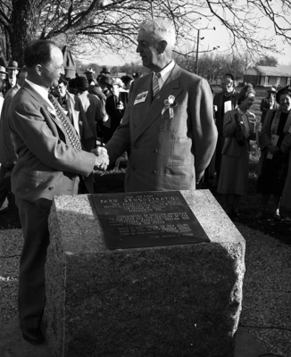 Descendants of the two men responsible for the start of county agent work with farmers in the country took part in dedicating a marker Thursday on the farm where the work started 50 years ago. pictured are Seaman A. Knapp of Ames, Iowa, left, grandson of Dr. Seaman A. Knapp, founder of the Agricultural Extension Service, and W. A. Porter, son of Walter Porter, Kaufman County farmer, on whose farm the movement started.