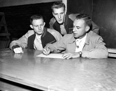 Jim Bridges, left, and Jerry Buck, two starters for Texas Wesleyan quintet which plays East Texas Baptist Friday night, get with Coach Dan Hart for final details on plans for game.