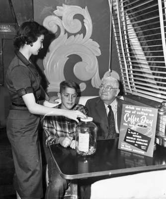 Customers throughout Fort Worth Thursday dropped donations in containers at cafes to promote research for victims of muscular dystrophy. Here Miss Wilma Jo Smith gives her contribution at the Clover Grill while two dystrophy victims, Jerry Dietrich, 13, and A. H. Montford, 69, smile with appreciation.