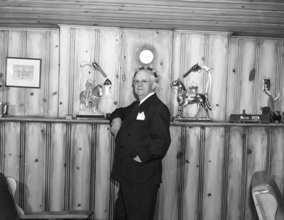 Edgar Deen, announced his retirement as secretary-general manager of the Southwestern Exposition and Fat Stock Show, is shown with mementos accumulated during his 40 years' association with the show. Published in Fort Worth Star-Telegram evening edition April 17, 1950.