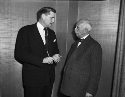 J. C. Penney, right, who spoke here in favor of fewer hands in the taxpayers' pockets and fewer trips to Washington for money, visits a moment with Estill Vance, president of Fort Worth National Bank.