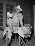 Wearing boots, tie, and hat that were gifts after 1938, 1944, and 1951 seasons, Texas Christian University Athletics Director L. R. (Dutch) Meyer, who was head coach 19 years, reads list of gifts given to him at Ex-Letterman's Association barbeque a previous night.