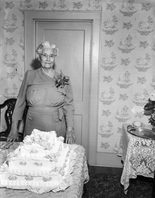 Image shows Mrs. T. J. Bills of 2220 Dalford celebrated her 82nd birthday. The party was given by her son, C. F. Bills, at 4617 Virginia Lane. Published in Fort Worth Star-Telegram morning edition April 17, 1950.