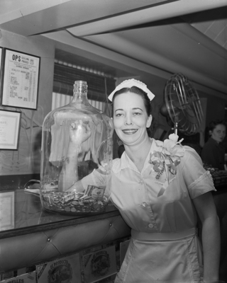 The hoped-for high money mark on the jug into which coffee money was dropped in a Fort Worth café during the city's observance of Coffee Day, designed to raise funds for macular dystrophy research, is indicated by Mrs. Mary Hodges, a waitress.