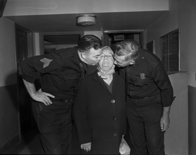 A kiss for "Ma" Carlton's 75th Birthday from Jail Sergeant Phil Coker, left, and Turnkey V. C. Bullard.