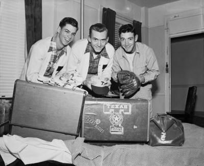 These three Texas A&M baseball players pack after their game with Texas Christian University had been postponed here. They left for Dallas to play Southern Methodist University. They are, left to right, Herschel Maltz, Bruce Morisse and Les Lackey.
