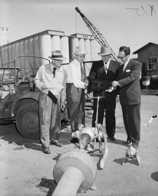 Atomic rays from the large machine at these men's feet penetrated the steel casting in front of it and took a picture of the steel. Examining the negative are, from left to right, J. P. Fowler, chief inspector at the Texas Steel Company, O. W. Fitz, who helped develop the gamma ray machine, and R. L. Brumm, consulting engineer. The machine at Brumm's feet is a smaller model of the other one.