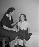The health of students is carefully guarded. Mrs. Sidney Newland watches over the health needs of about 1600 students in Sam Rosen and M. G. Ellis Elementary Schools and North Side High School. She takes the temperature of Suzanne McDonald, a fourth grade student at Sam Rosen.