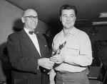 Texas Railroad Commissioner Olin Culberson, left, hands a gold trophy to Bill Souder, chief of the Hurst fire department, after the Hurst team won the pumper race at Saginaw.