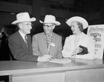 Dr. Frank R. Jones, left, president of Globe Laboratories, takes over at the company's international merchandising meeting at Hotel Texas to help register two of the Canadian druggists who came by bus to attend the session. Those being Ralph T. Walker of Calgary, Canadian distributor for Globe, and Miss Margaret McKinnell, Hardisty.