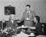 Lord James Milner, left, has a cup of tea with his Fort Worth hosts, Mr. and Mrs. Leavy after arriving here for a speech sponsored by the English-Speaking Union. His talk, open to the public, will be presented in the Texas Christian University Theater.