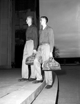 Fred Saunders, left, and Bob Waggener, 6-7 University of Texas cagers, enter Will Rogers memorial Coliseum for workout after team's arrival Monday for Tuesday night's SCW tilt.