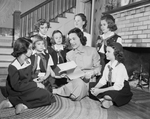 The Fort Worth Council of Camp Fire Girls celebrate the 43rd anniversary of the organization. The mothers who used to be a Camp Fire Girl are celebrating the anniversary with the second generation. Shown is Mrs. J. F. Munden, 3201 Greene, surrounded by a group of Camp Fire Girls, left to right, Jeanie Labovitz, Lynda Brown, Carol Ann Stevenson, Judy Brown, Ann Kinard, Mrs. Munden, Debby Brachman and Donna Marie Munden.