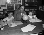 J. W. Edwards joined his daughter, Carol, 9, and Gerald Philpot, 9, son of Mr. and Mrs. Philpot, at George C. Clarke Elementary School in a geography lesson on the first school day of Public Schools Week.