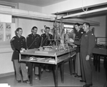 A scale model mockup of a transpport, provides true to life basis for instruction on loading and unloading cargo in this Army Transportation Corps ROTC class at TCU. Left to right are: Cadet Master Sargent Billy J. Kise, Cadet Colonel Flavil L. Johnson, Cadet Captain Louis C. Abbott Jr., Cadet 2nd Liutenant Charles E. Posey, and Captain John Randlec.