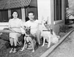 Mr. and Mrs. Bert L. Hutchinson, both blind, took time out Thursday to help their dogs get acquainted. The man has had his animal two years, but Mrs. Hutchinson brought back her guide dog to Fort Worth Wednesday night.