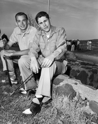 Paul Pegues of Cleburne High School relaxes after scoring hole in one in Recreation golf meet Saturday and next is an unidenified man.