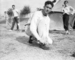Mickey Wilborn of Oklahoma A&M, tying shoe.
