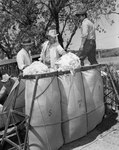 Shorn wool is sacked up for delivery to the warehouse after it is graded into one of three staple lengths. The sacks hold around 150 pounds of wool each. Published in Fort Worth Star-Telegram morning edition May 7, 1950.