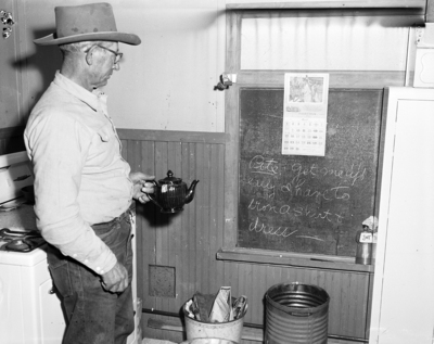 Pete Workman reading school blackboard saying "Pete, get me up early. I have to iron shirt and dress."