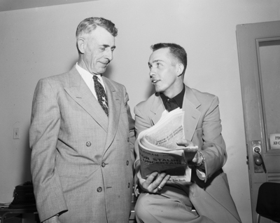 Carroll Beringer, right, pitcher with the Cats in 1950 and 1951, was a La Grave Field visitor Saturday, along with his father, Pete. Carroll wants to return to Cats this year. He is on way to Vero Beach, where Dodger chain clubs are training.