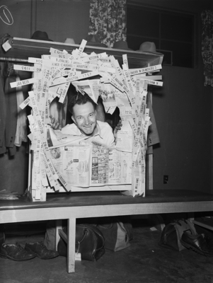 Dana Morris, one of Fort Worth's four champions in the state bowling meet which ended here, beams over Class C all-events, B double titles. Published in Fort Worth Star-Telegram, morning edition April 18, 1950.